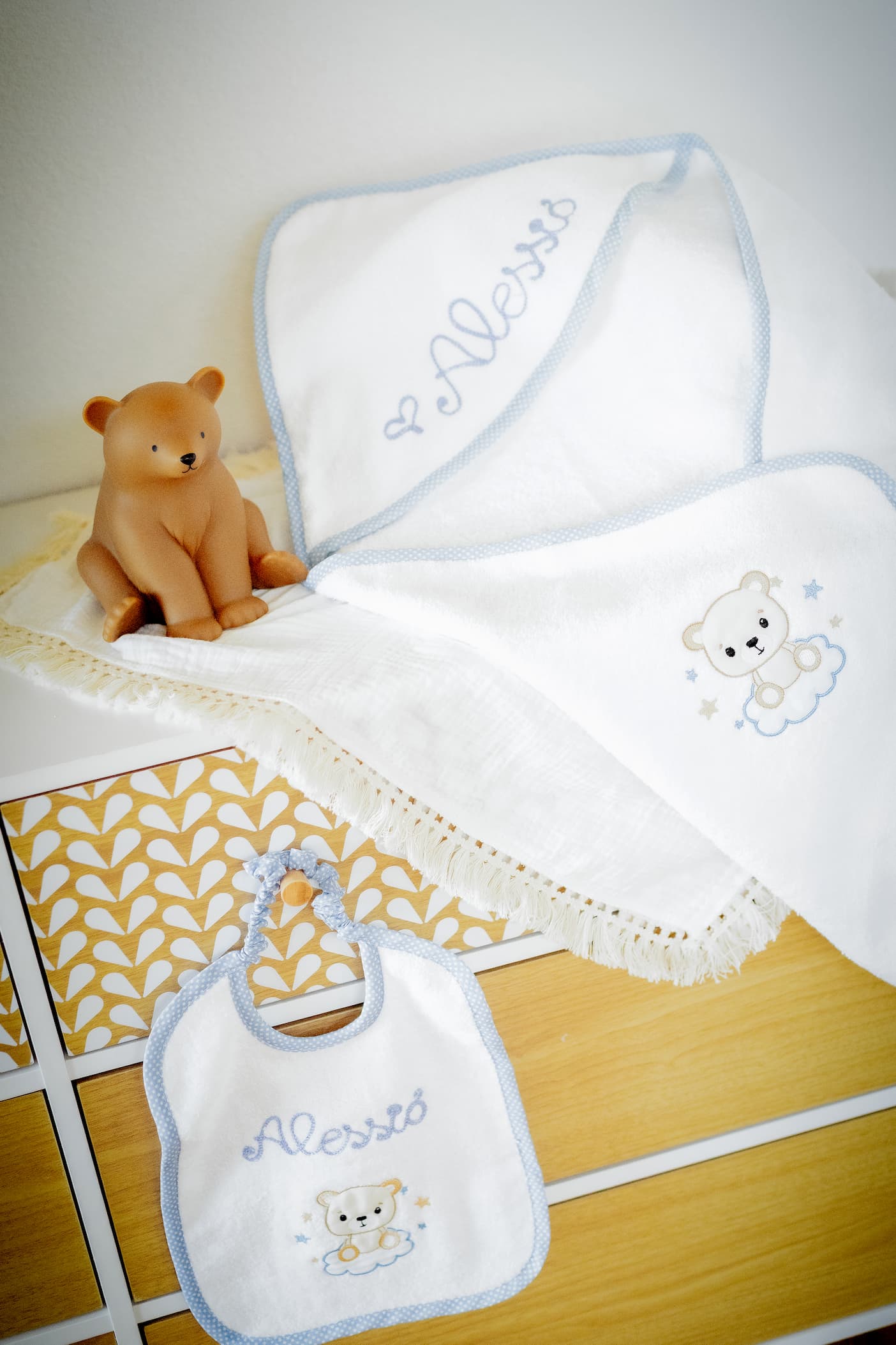 Un geste simple après le bain, mais rempli d’amour, qui se transforme en rituel chaleureux et inoubliable. Avec un broderie artisanale réalisée à la main en Italie.