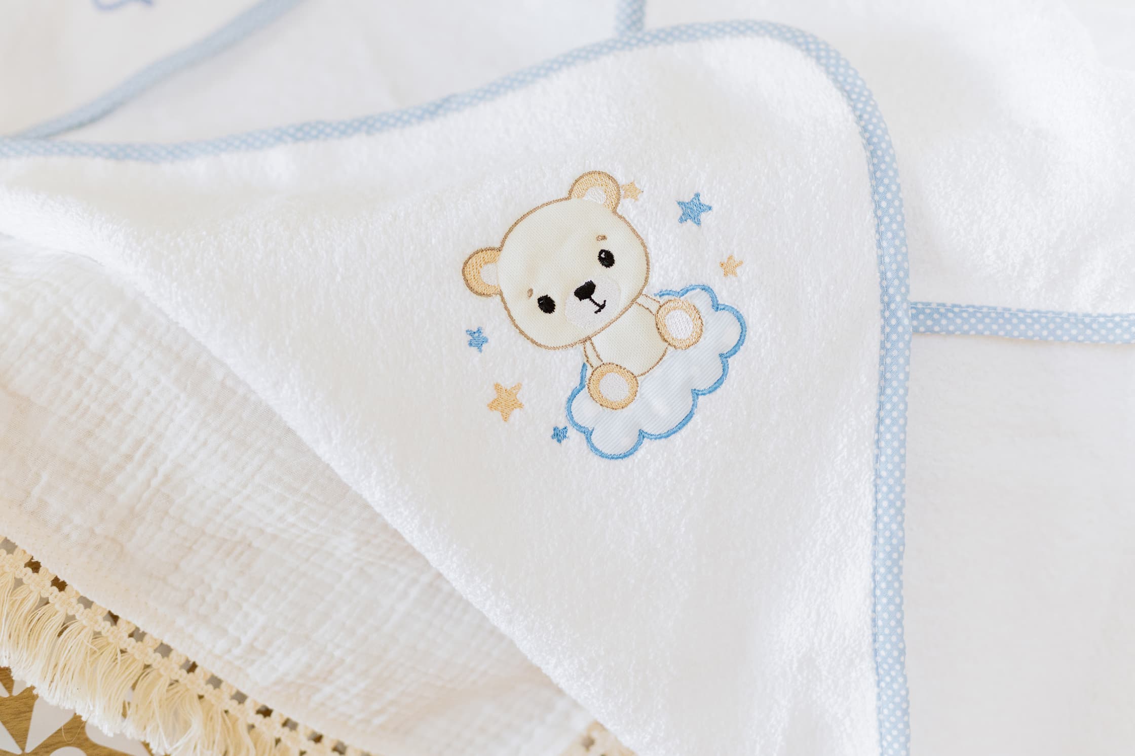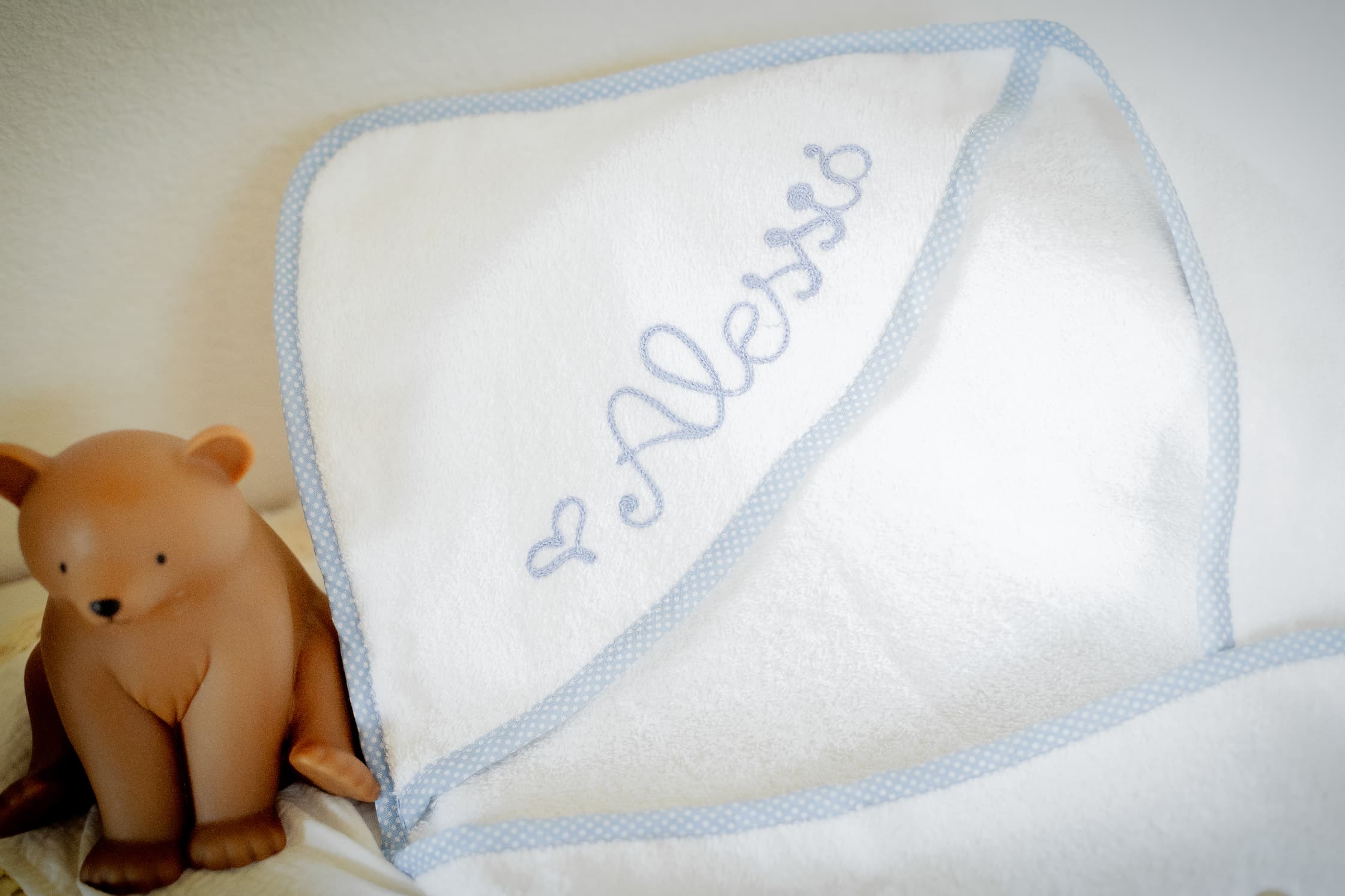 Rendez cette cape de bain encore plus spéciale grâce à une broderie artisanale réalisé à la main en Italie, avec le prénom de votre enfant et le motif de votre choix.
